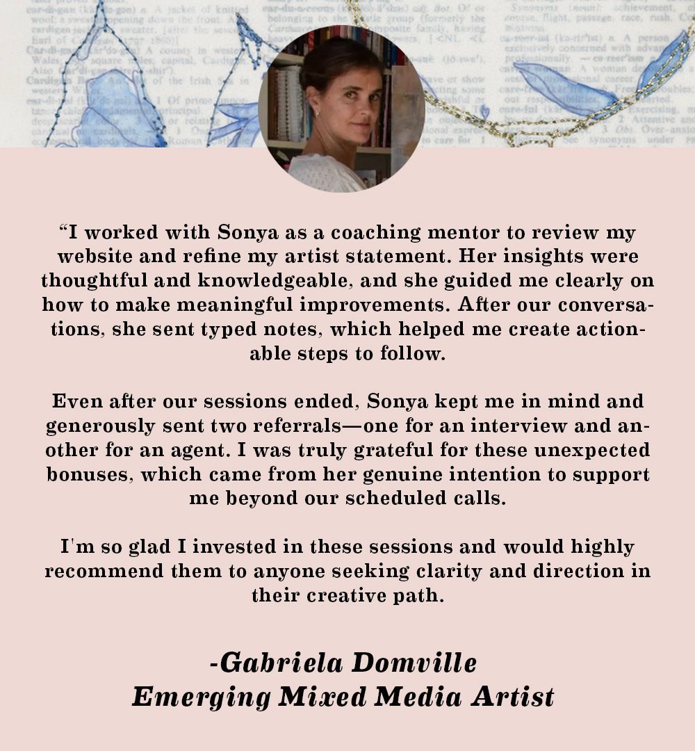 My 1:1 virtual art consultation with Sonya ​Sparks is the best investment I've made in myself since starting this journey. She helped​ me to crystallize what I want​ to say with my art and ​clarify why I’m driven ​t​o paint what I do. She made me think in concrete terms ​about what my goals are​, and ​I've already seen results.